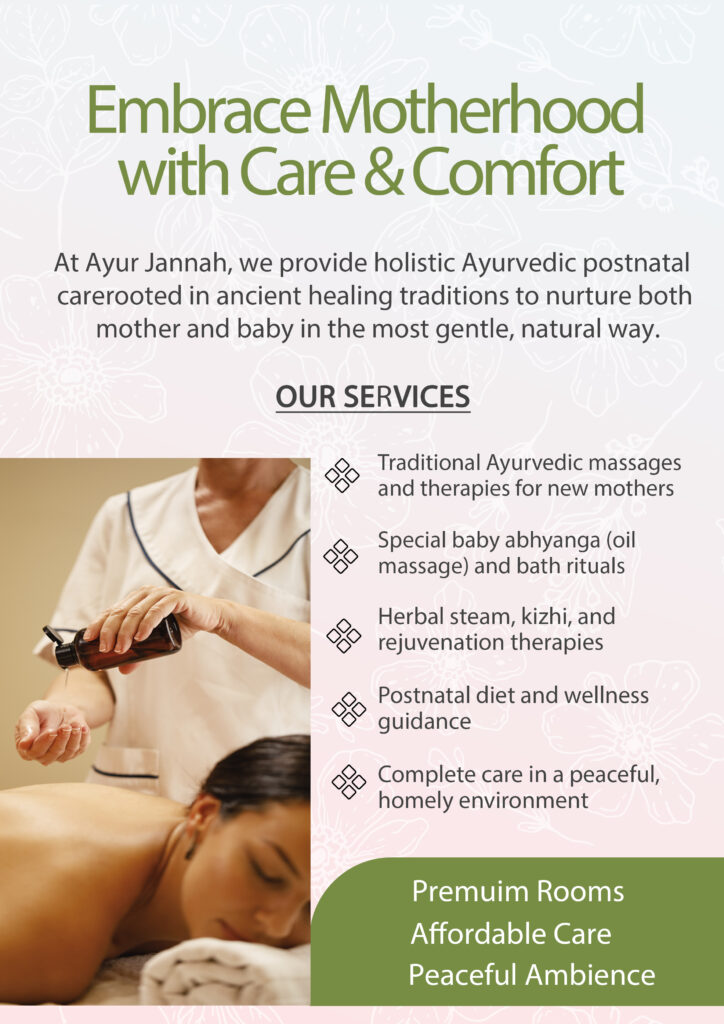 Get the best postnatal care in Thrissur with expert support for new mothers. We provide safe recovery, traditional care, and guidance for mother and baby’s health and wellbeing